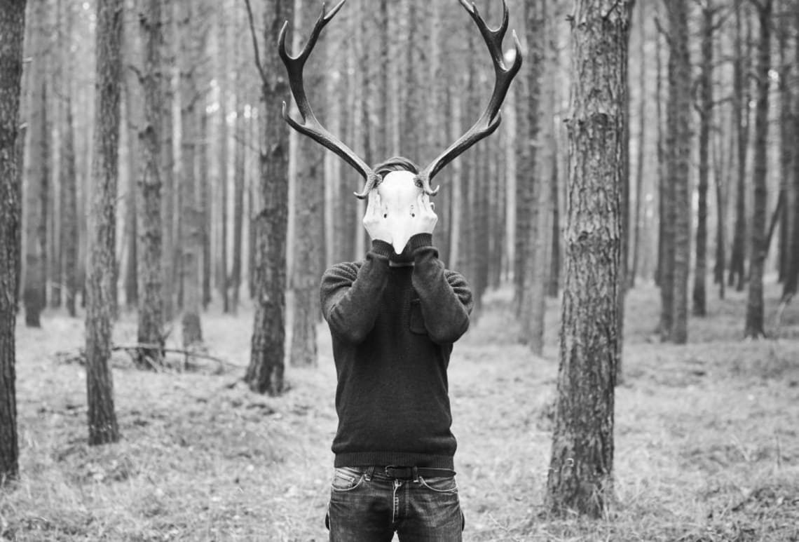 Hjorten stod i skogbrynet og var ulukkeleg. Han kjende det som om det var liten vits i alt, som om han berre kunne gje opp. Her går eg, dag inn og dag ut, tenkte hjorten, og så er det ingen som ser meg. Er eg usynleg, eller kva? Det trudde han ikkje. Her går eg og kunne endre menneskelagnader om nokon såg meg, men så er det ingen som ser meg. Her går eg og er ein hjort, og så er det ingen som bryr seg om det. Det er meininga at eg skal vere vanskeleg å sjå, eg veit det, eg skal snike meg rundt i skogane og ikkje bli sett. Det er desse livsgrunnlaga eg no er ulukkeleg for. Eg vil bli sett. Eg har stilt meg opp i eit skogbryn. Eg er open for blikk, for skot. Dersom ikkje nokon ser meg snart, gjer eg noko drastisk, eg meiner det. Akkurat no er det som om eg er stengt inne i eit hjortemønster. Å, eg skulle gjerne ha endra på alt, blitt ein annan, noko heilt anna. Å, tenk om eg kunne vore eit rådyr, ein elg.